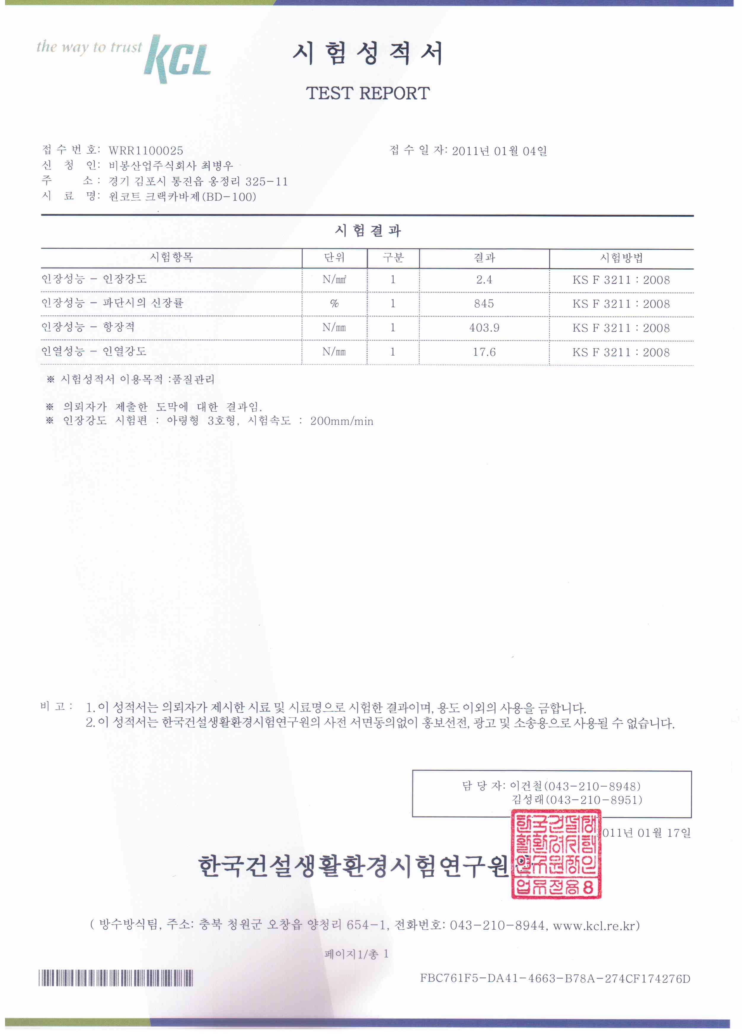 | 107 | BE-7007 특수내산코팅제 시험성적서 | 관리자 | 11.02.22 | |