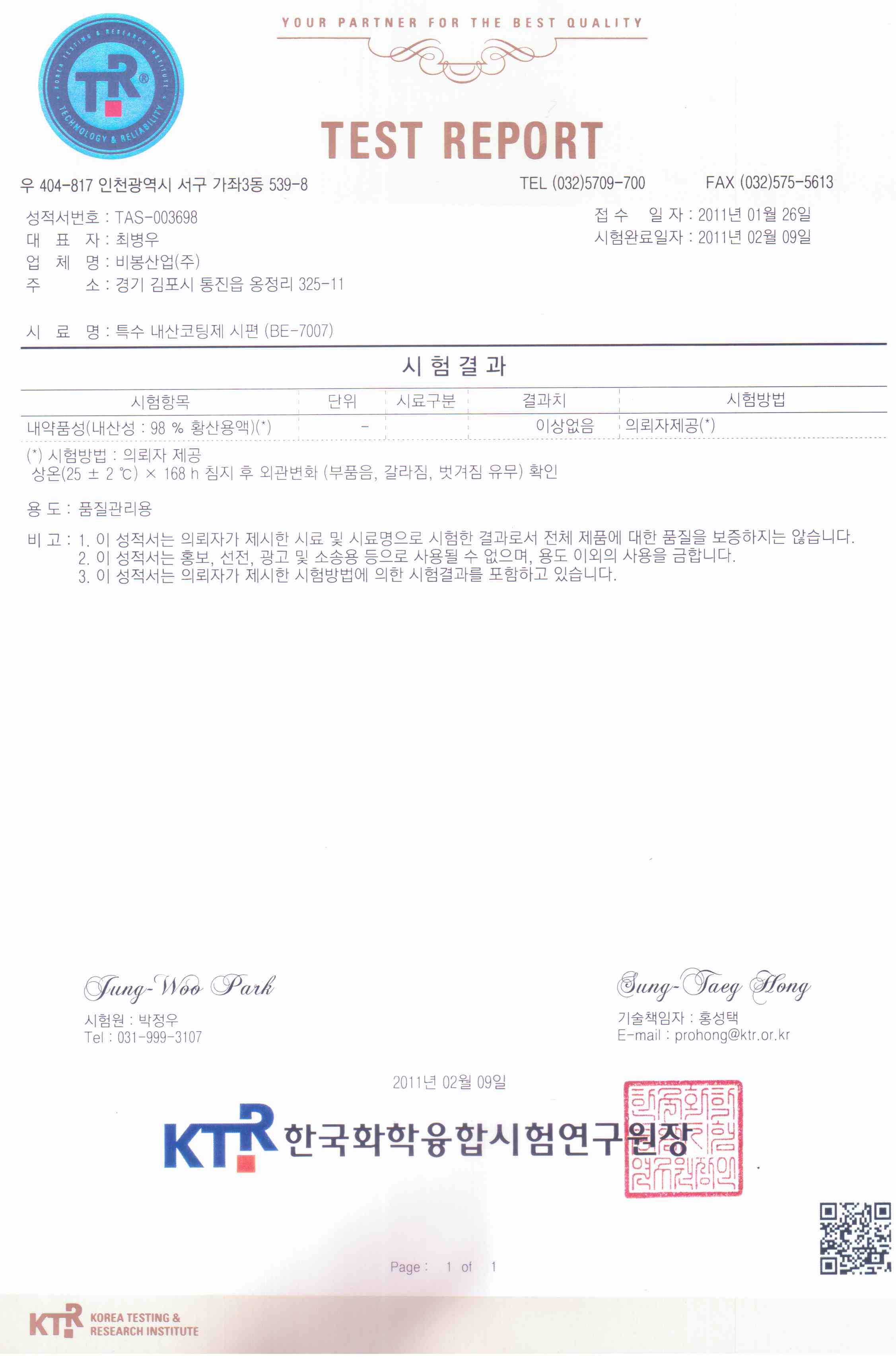 | 106 | BE-7007 특수내산코팅제 시험성적서 | 관리자 | 11.02.22 | |