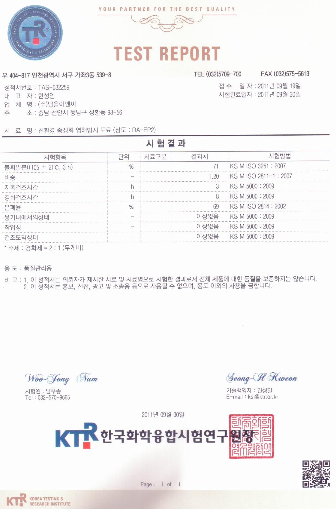 | » | 친환경 중성화 염해방지 도료 시험성적서 | 관리자 | 11.10.01 | |