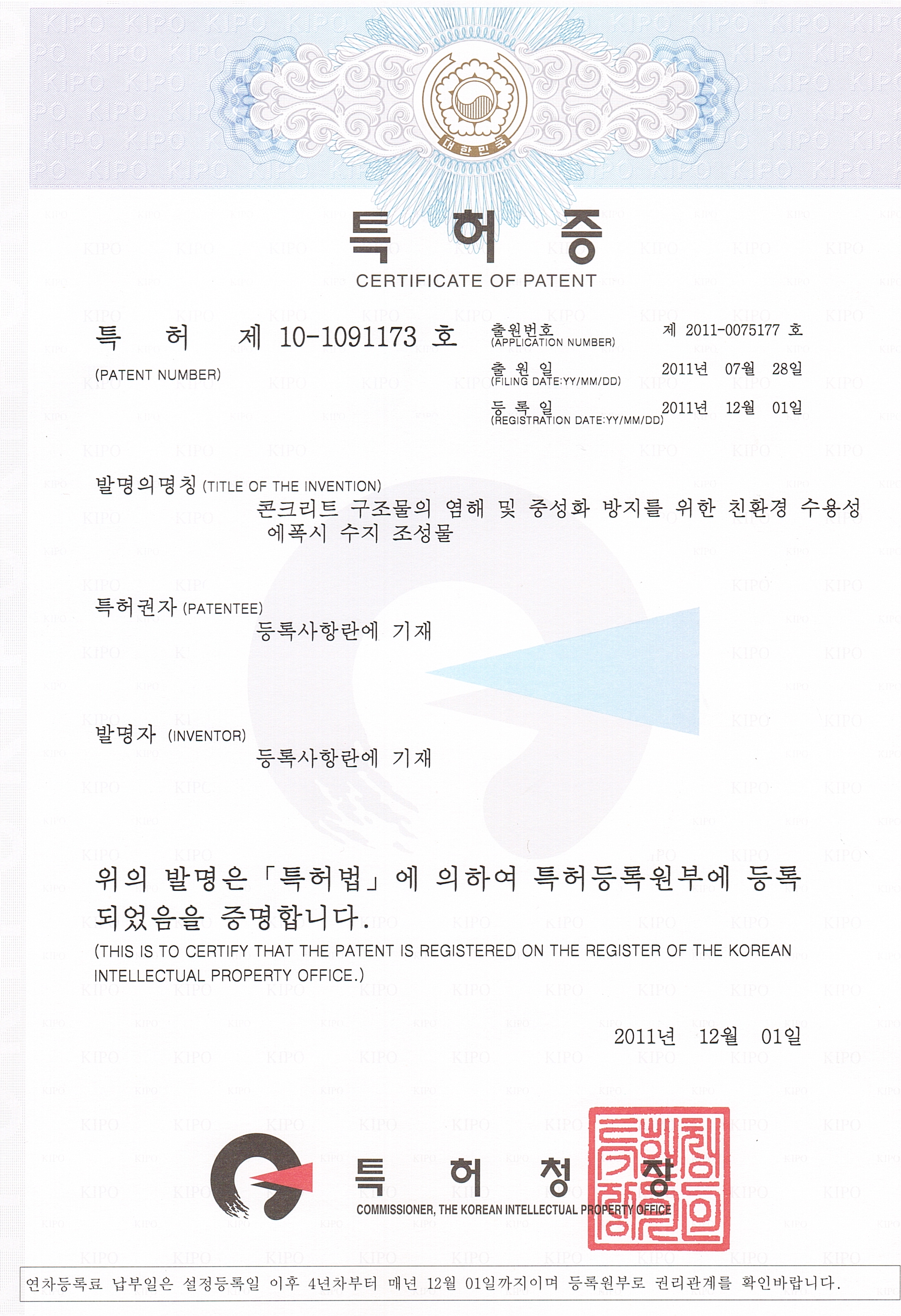 | » | 특허증 (친환경염해방지용 수용성에폭시) | 관리자 | 11.12.19 | |