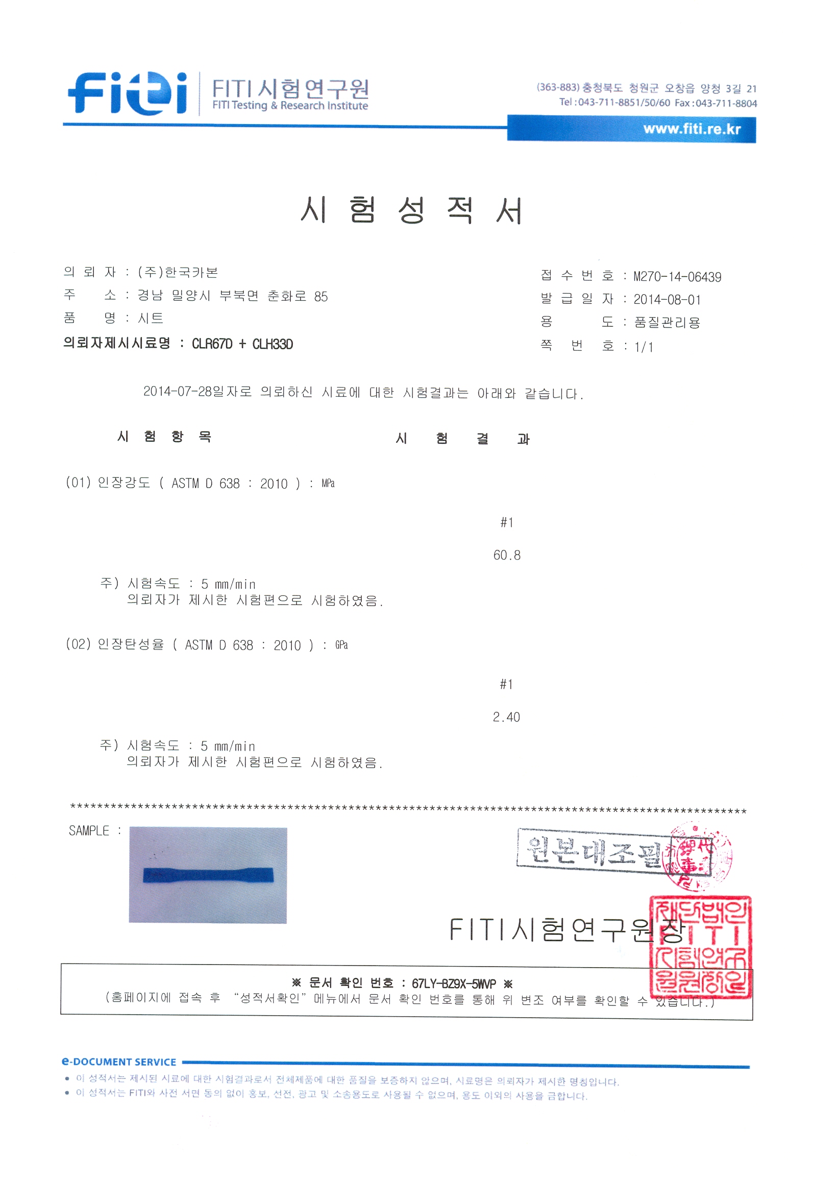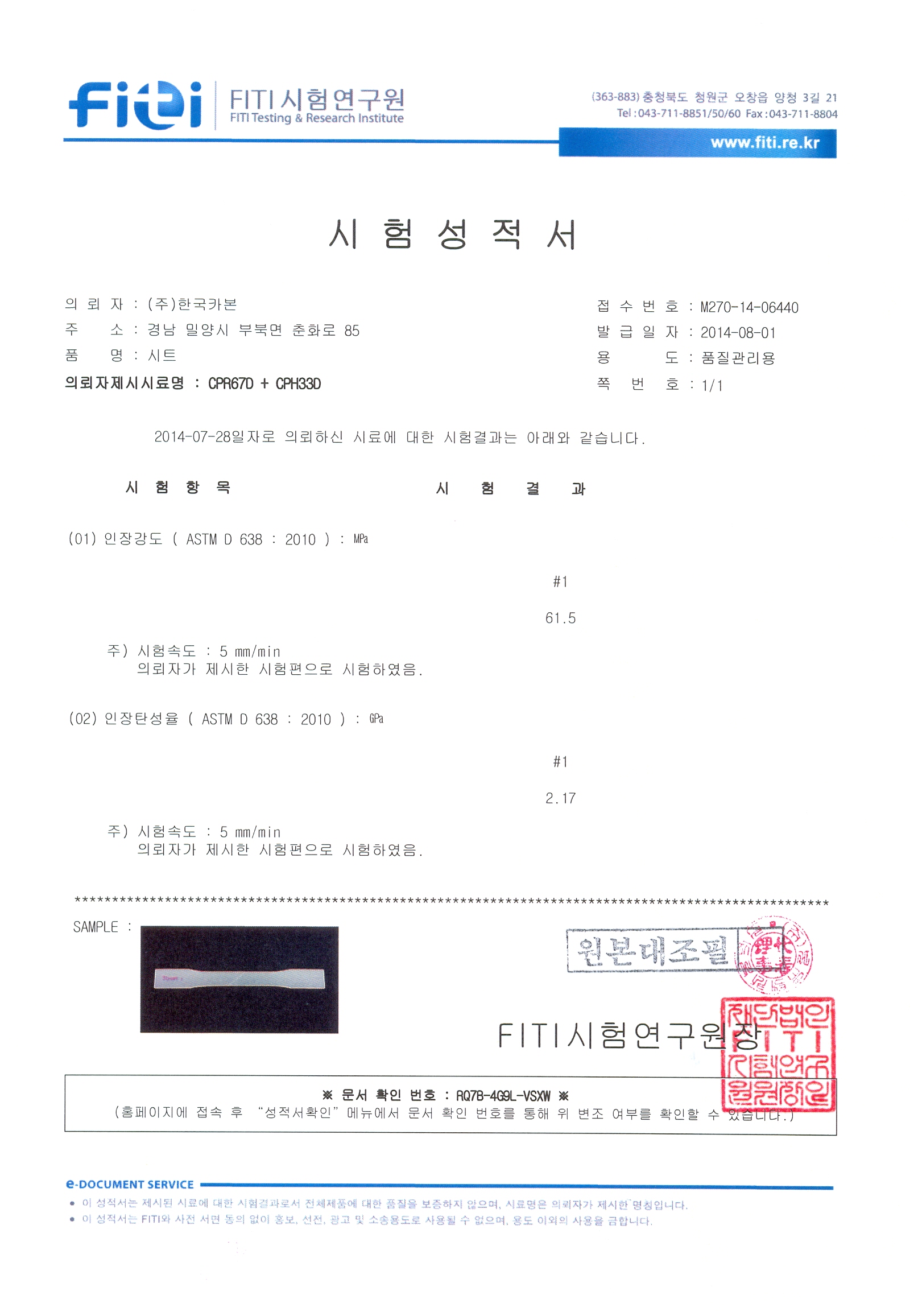 한국카본 섬유레진 시험성적서