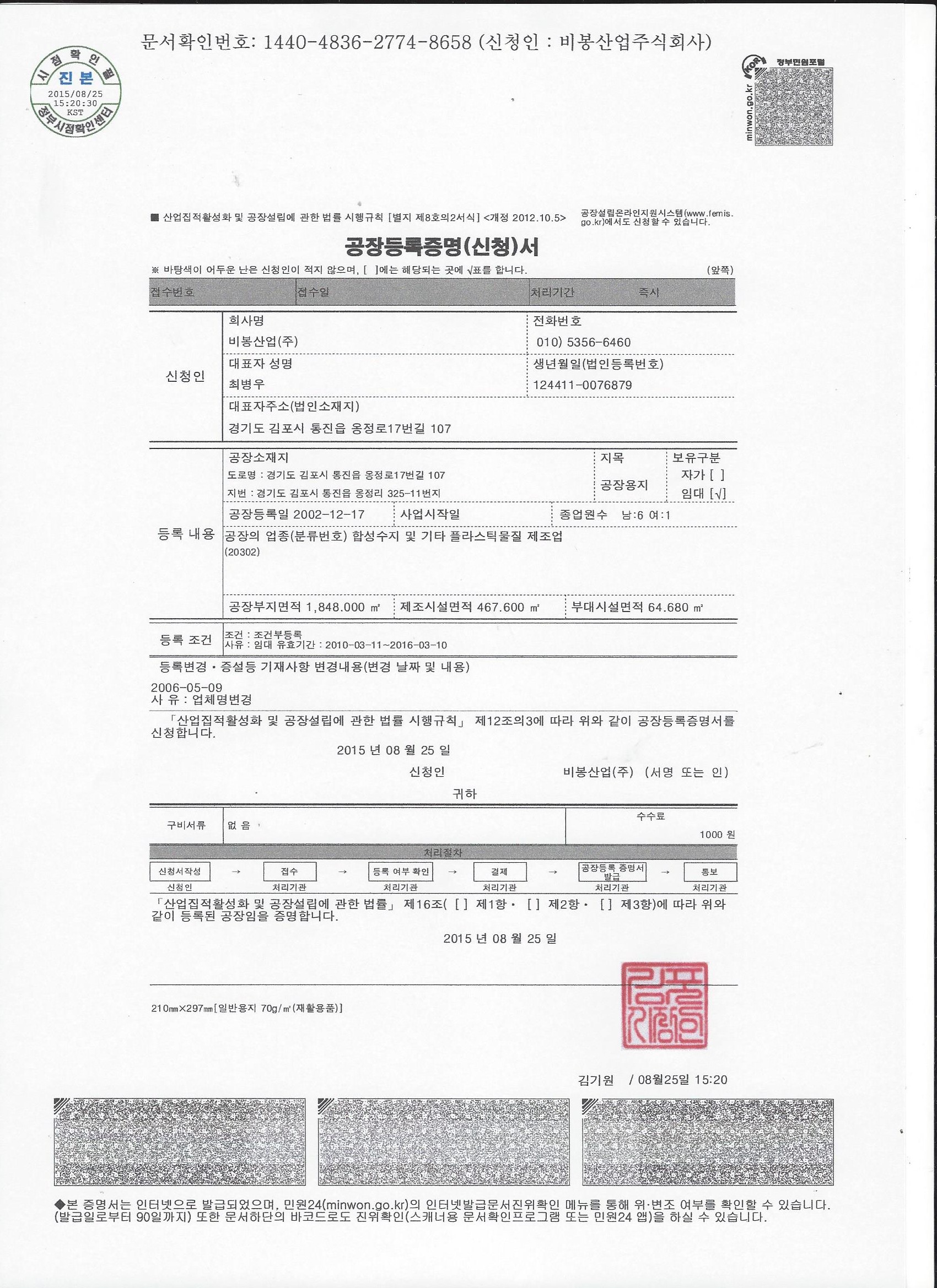 비봉산업 (주) 공장등록증 2015년 8월 발급