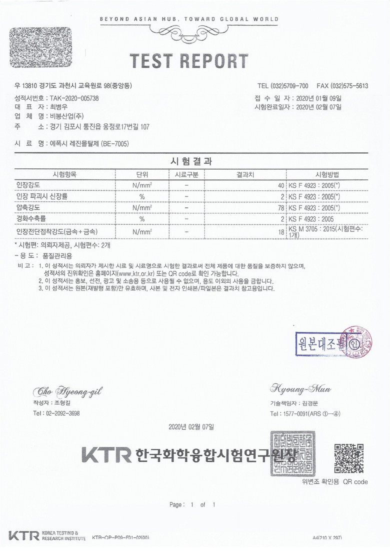레진몰탈제 BE-7005 시험성적서 입니다