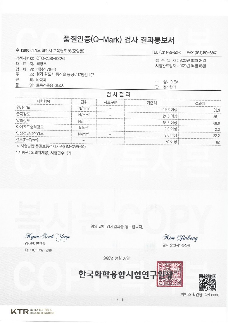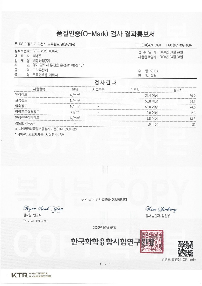에폭시 자재에 대한 큐마크 인증 심사 합격에 의한 시험성적서 입닏