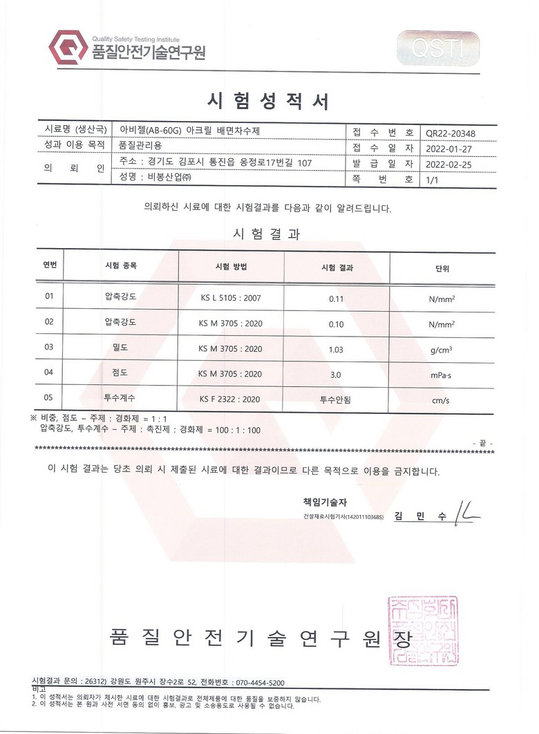 아비젤 이액형 아크릴배면차수제 시험성적서 AB-60G (2022년)