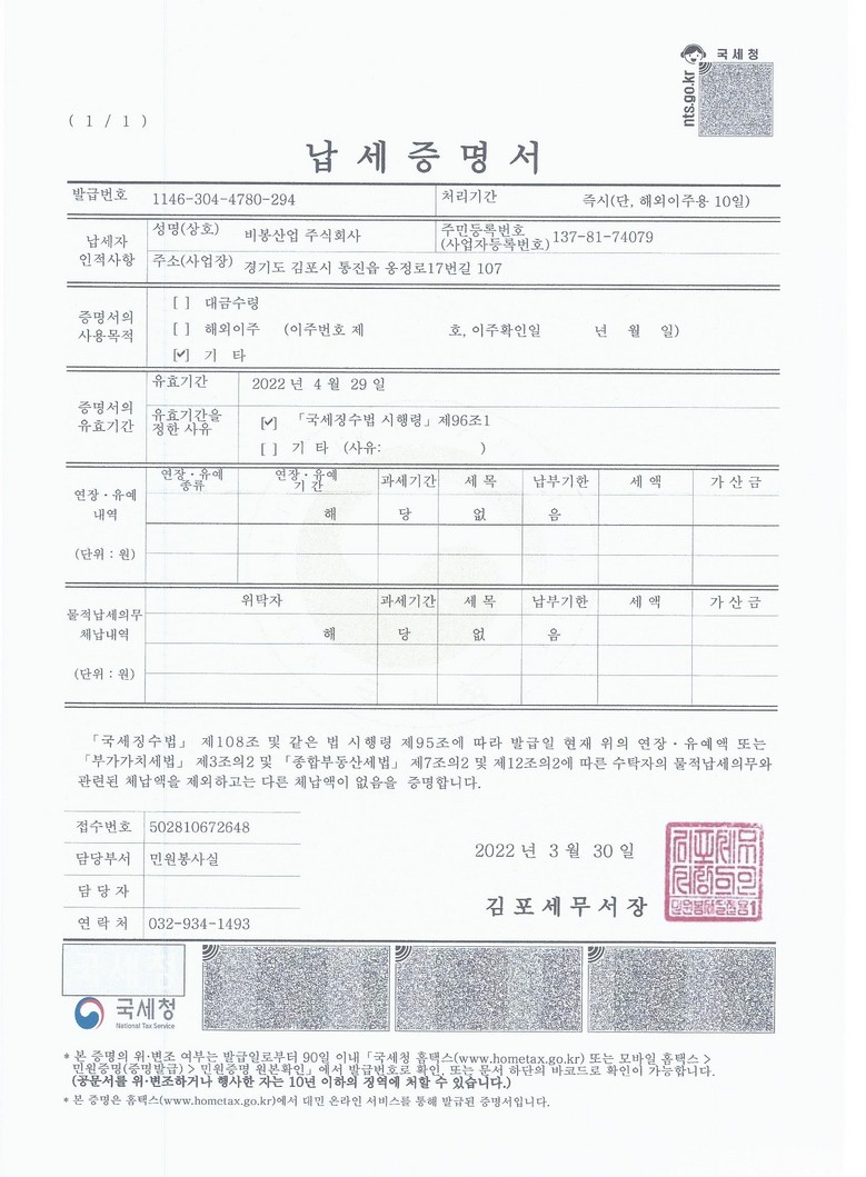 비봉산업 자재 승인서류중 납세 지방세 입니다