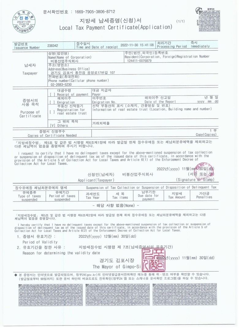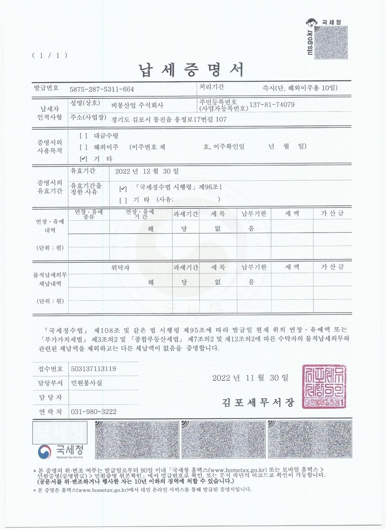 | » | 비봉산업 납세 지방세 완납 증명서 | 비봉관리자 | 22.11.30 | |