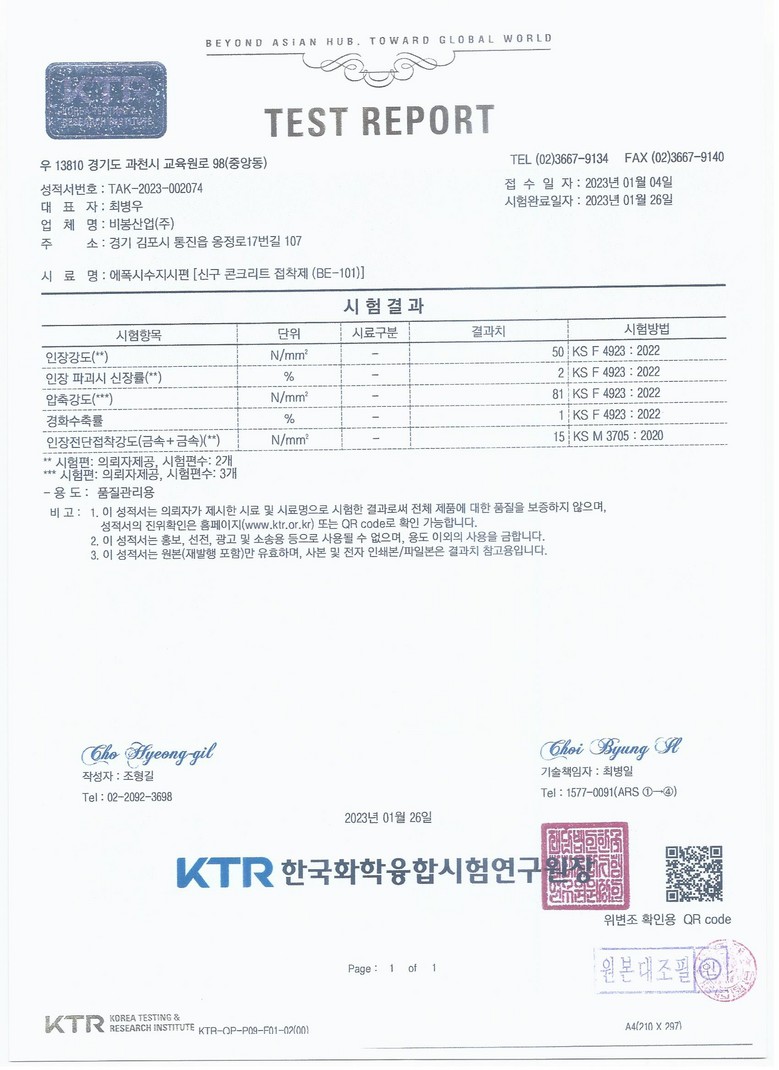 | » | 2023년 시험성적서 (신구접착제 BE-101) | 비봉관리자 | 23.02.02 | |