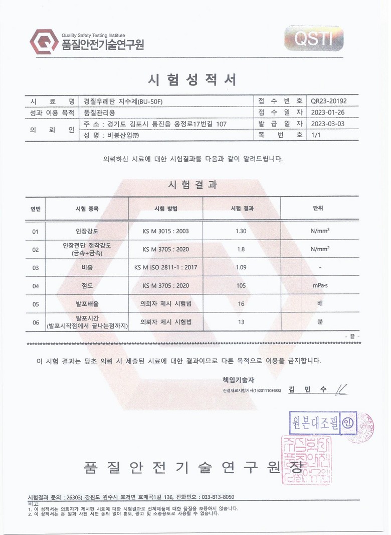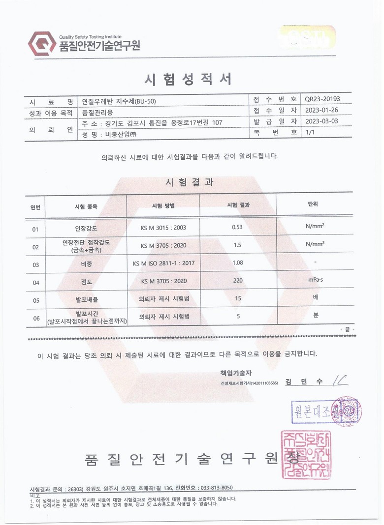 | » | 2023년 시험성적서 경질,연질우레탄지수제. 아크릴주입제 (아비젤) 시험성적서입니다 | 비봉관리자 | 23.03.06 | |