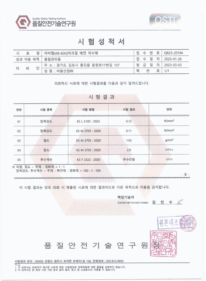 2023년 시험성적서 경질,연질우레탄지수제. 아크릴주입제 (아비젤) 시험성적서입니다