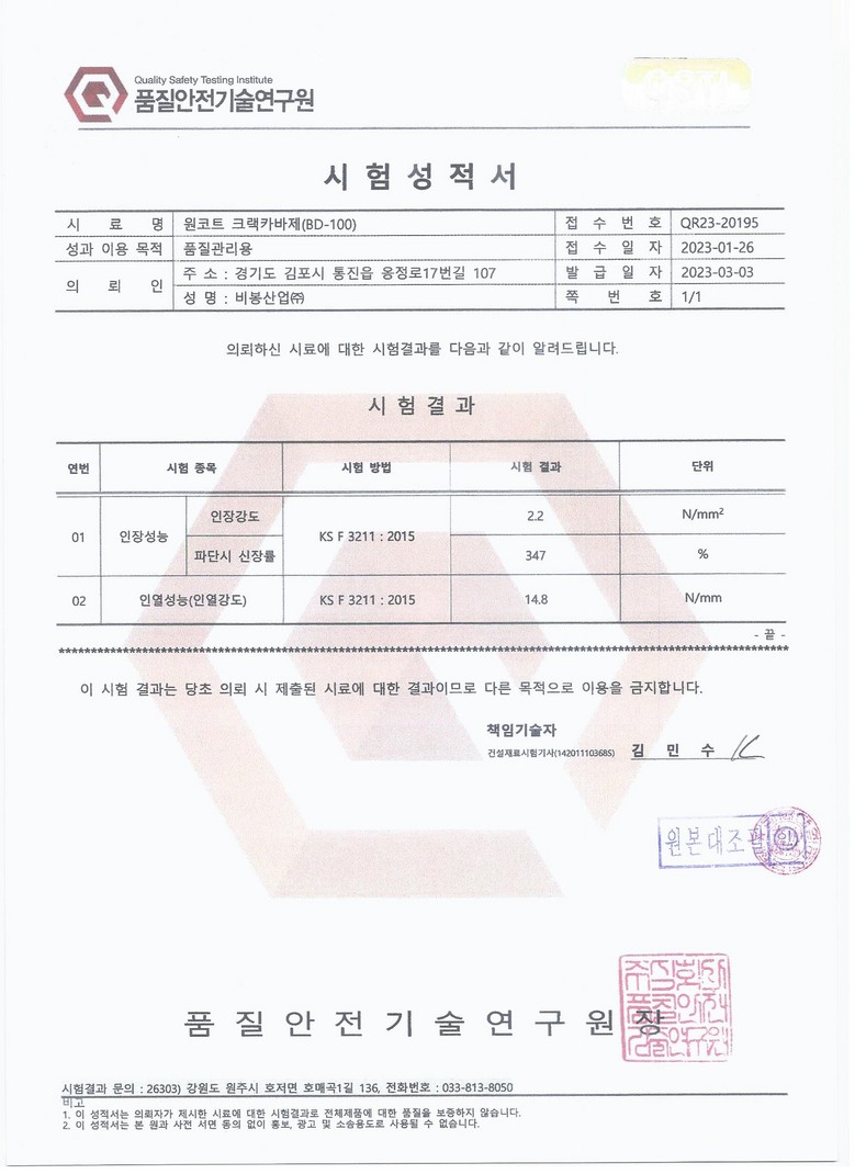 원코트 크랙카바제 시험성적서입니다