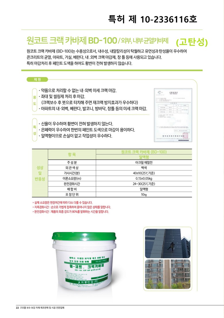 : 원코트크랙카바제시험성적서(2026).pdf / size: 865.2 KB 콘크리트외벽무황변을가진고탄성크랙보수공법(원코트).jpg / size: 492.6 KB 비봉카달로그23(원코트크랙카바제)(특허번호삽입).jpg / size: 709.5 KB | ||||