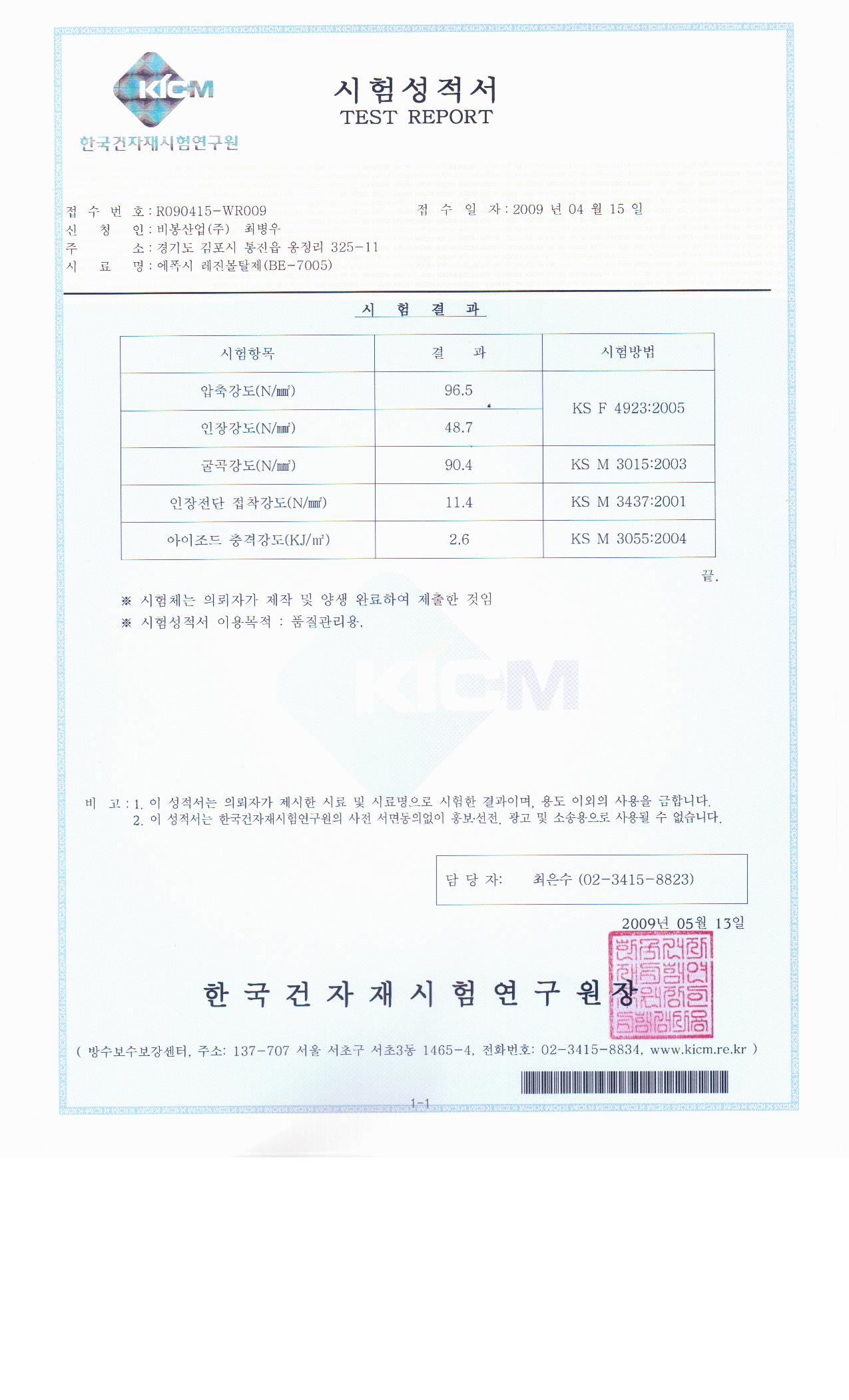 레진몰탈제 시험성적서 2009년