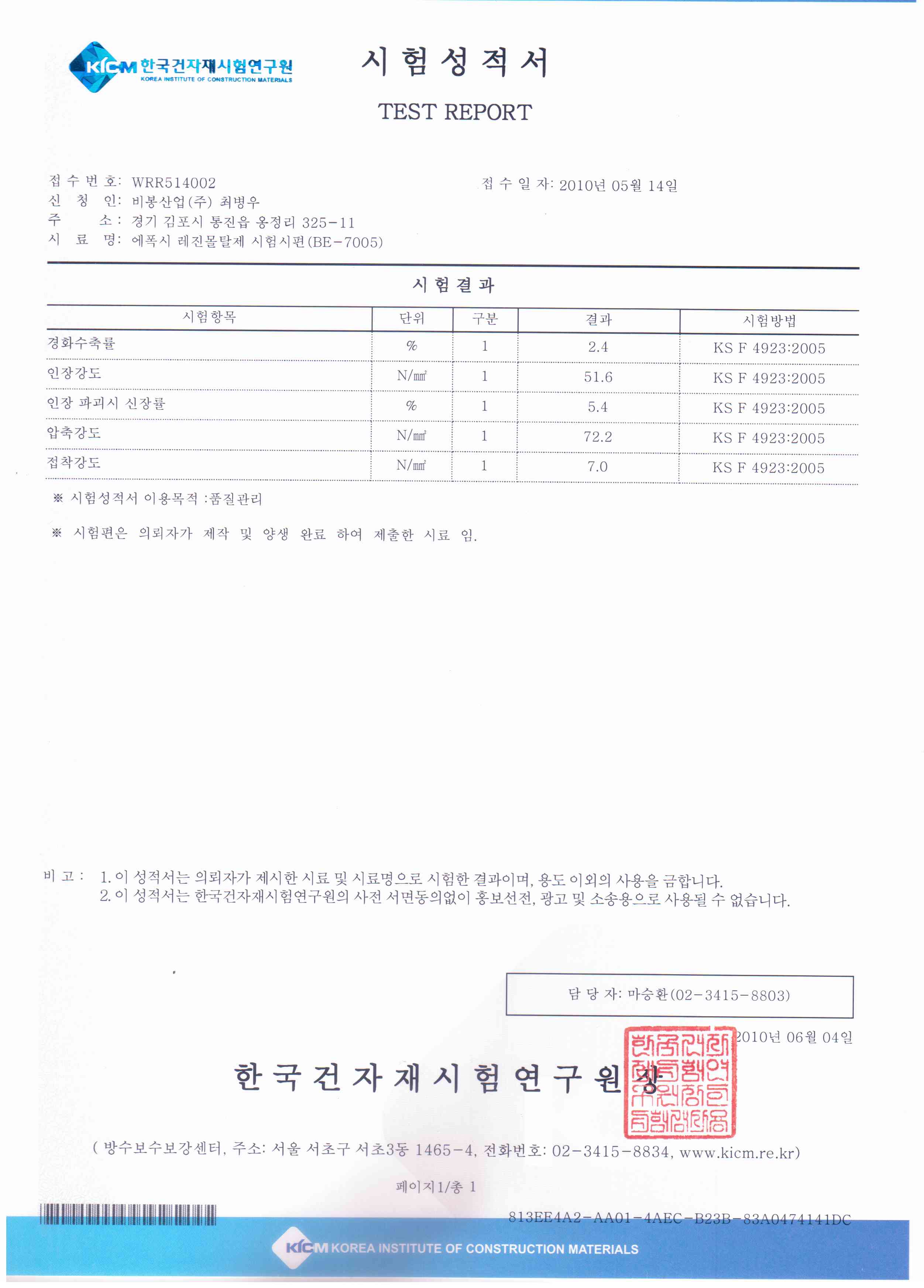 | 96 | 2010년 시험성적서 중점도 주입제 . 탄성씰링제 . 원코트 | 관리자 | 10.01.22 | |