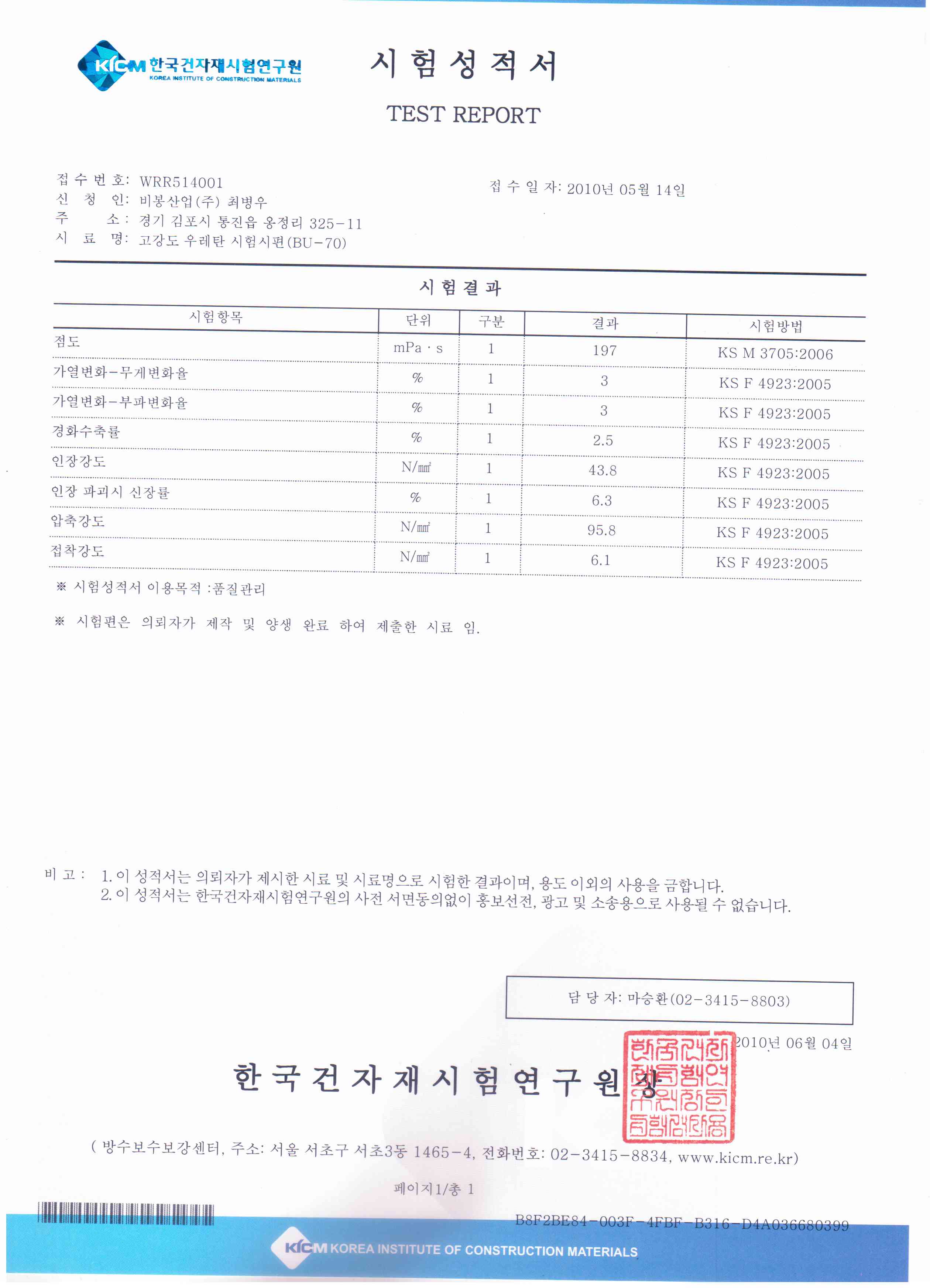 | 100 | 탄성주입제 탄성씰링제 (2010년 ) 성적서 | 관리자 | 10.06.08 |