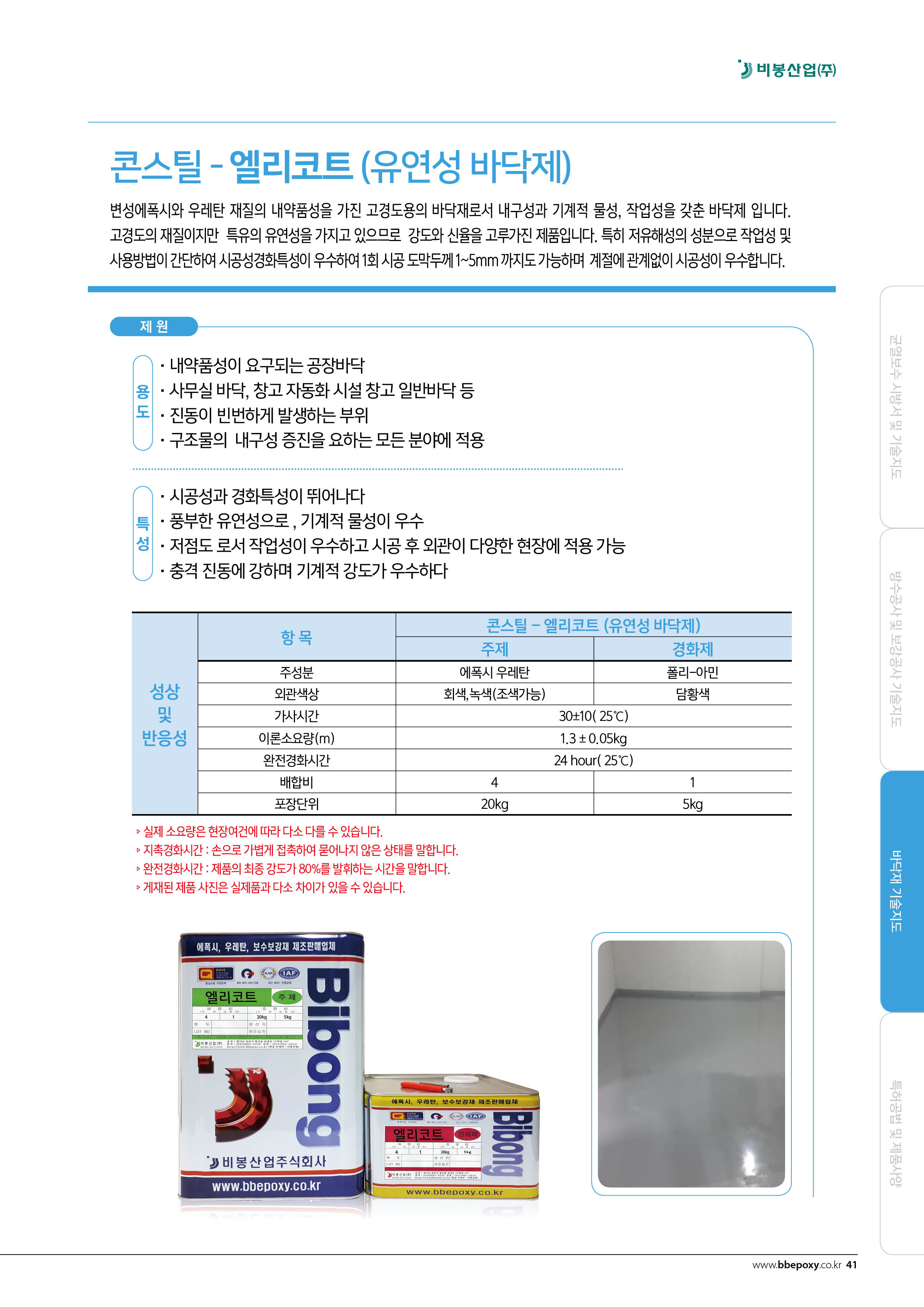 콘스틸 엘리코트(유연성 바닥제) 주성분 에폭시 우레탄 / 폴리아민 변성에폭시와 우레탄 재질의 내약품성을 가지 고경도용의 바닥재로서 내구성과 기계적 물성 작업성이 우수한 제품입니다 주로 사무실 바닥 창고 바닥 일반주차장 바닥공사에도 좋습니다진동이 빈번하게 발생하는 부위 등 충격진동에 강한 우수한 제품