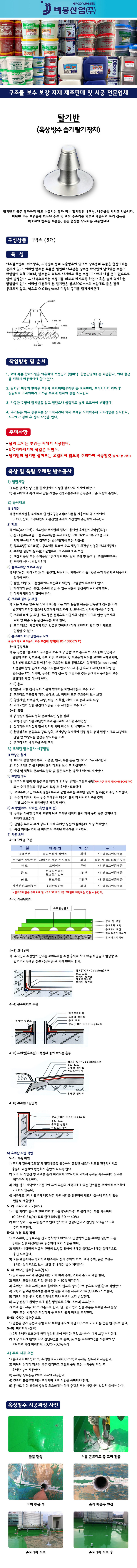 이러한 방수층 부풀음 원인의 대부분은 방수층 바닥면에 남아있는 수분이 태양열에 의해 기화돼, 방수층의 외부로 나가려고 하는 수증기가 빠져 나갈 곳이 없으므로 인해 발생한다. 그 대책으로서는 수증기를 외부로 빠지도록 하던가 혹은 눌러 억제하는 방법밖에 없다. 이러한 여건하에 본 탈기반은 상부200mm의 수압에도 물은 전혀 통과되지 않고, 역으로 0.01kg/cm2 이상의 공기를 탈기시켜준다.